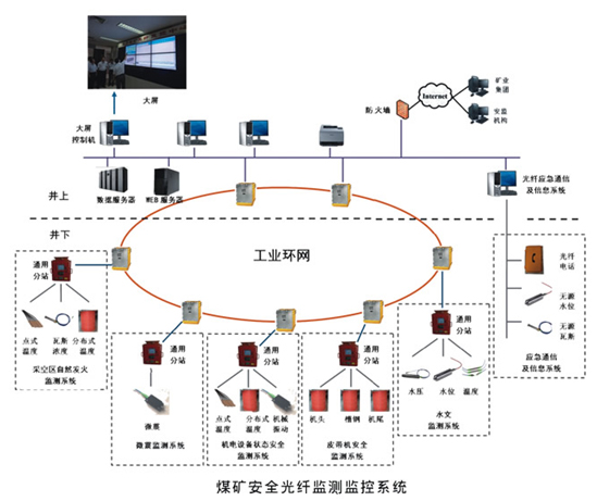 系統(tǒng)特點(diǎn):光纖傳感器無(wú)源,解決了對(duì)采空區(qū)、頂板等不宜安裝電子設(shè)備地點(diǎn)安全隱患監(jiān)測(cè)的難題;井下分站系統(tǒng)容量大,可連接多種傳感器,實(shí)現(xiàn)對(duì)煤礦機(jī)電設(shè)備、電纜、頂板、水文等全方位的監(jiān)測(cè);系統(tǒng)兼容性強(qiáng),可以直接接入光纖工業(yè)以太網(wǎng);光纖瓦斯傳感器維護(hù)周期長(zhǎng),免校準(zhǔn)。