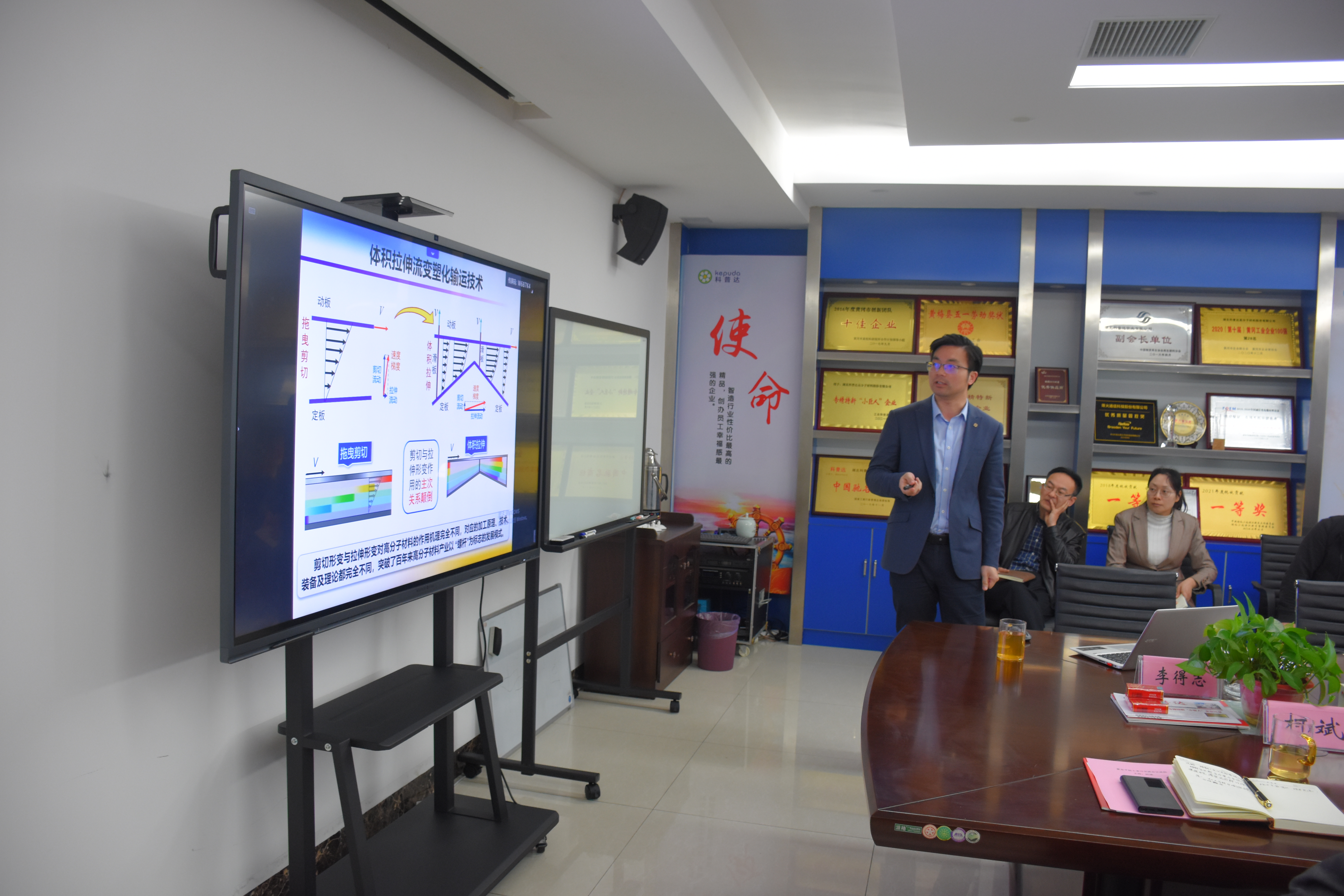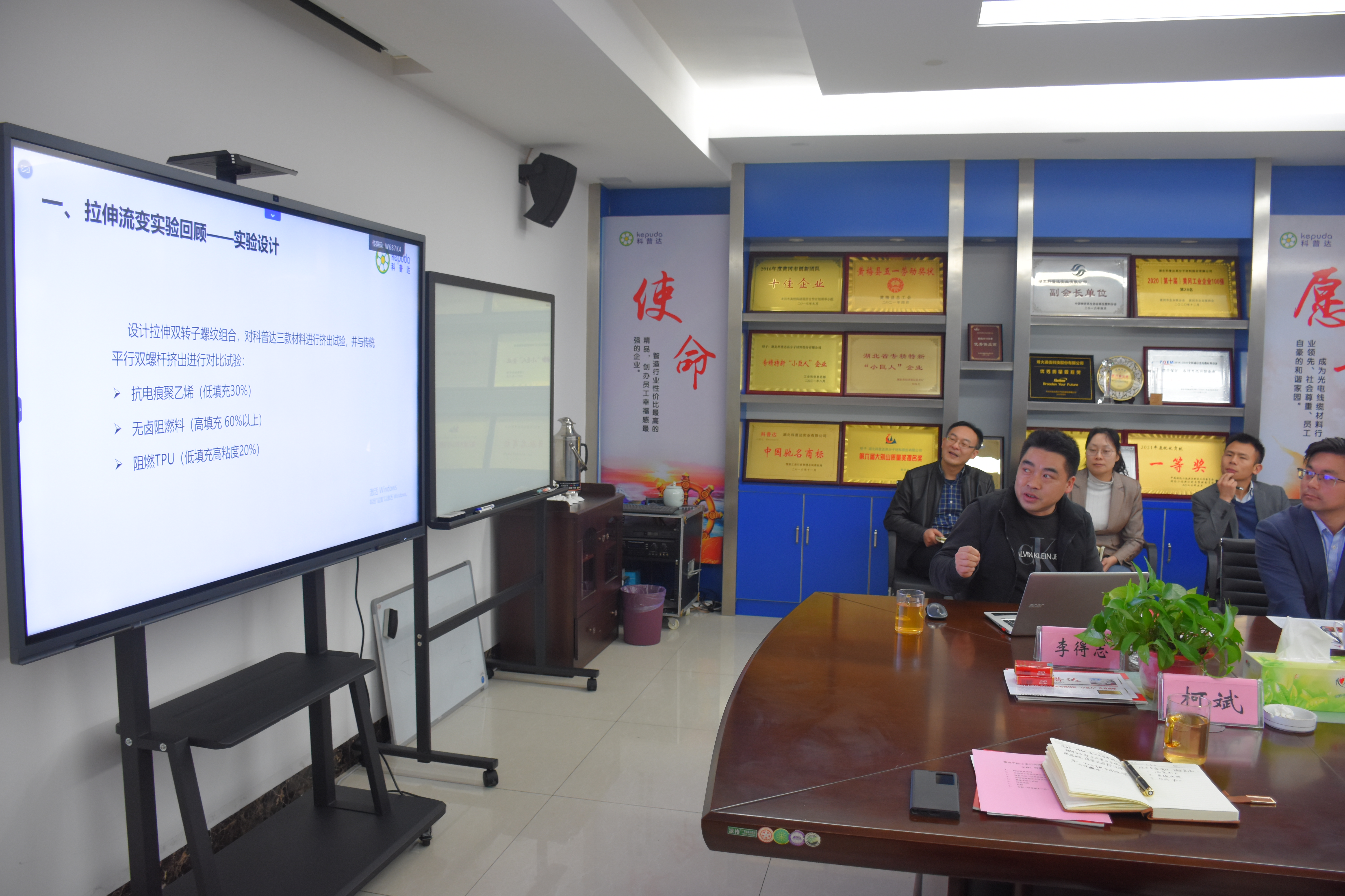 公司技術(shù)總工李得志匯報了前期與華南理工大學合作的拉伸流變技術(shù)的項目情況,在TPU彈性體加工上良好的表現(xiàn),加工產(chǎn)品性能優(yōu)異,但在高填充無鹵產(chǎn)品上面有待設(shè)備技術(shù)調(diào)整;并提出了相應的技術(shù)訴求,諸如密煉機轉(zhuǎn)子的改進、高填充材料的拉伸流變螺桿改進、自動上料系統(tǒng)的新方案等訴求。